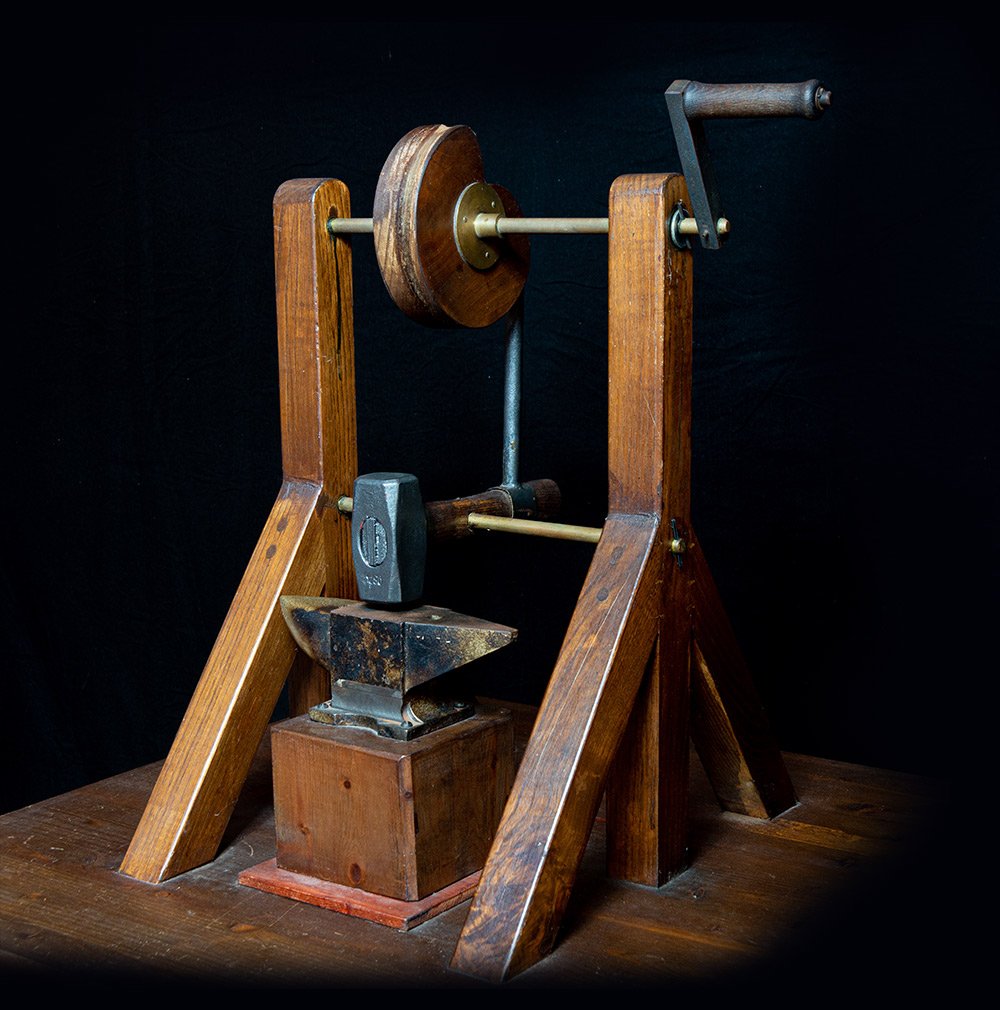 El martillo de leva es un órgano mecánico que transforma el movimiento giratorio en movimiento alterno intermitente.. Leonardo utilizó el martillo de leva para golpear un yunque con un martillo, facilitando así la tarea de trabajar metales.. Para aliviar la fatiga, se proporcionó una manivela que, al girarla en sentido antihorario, hacía funcionar la máquina..