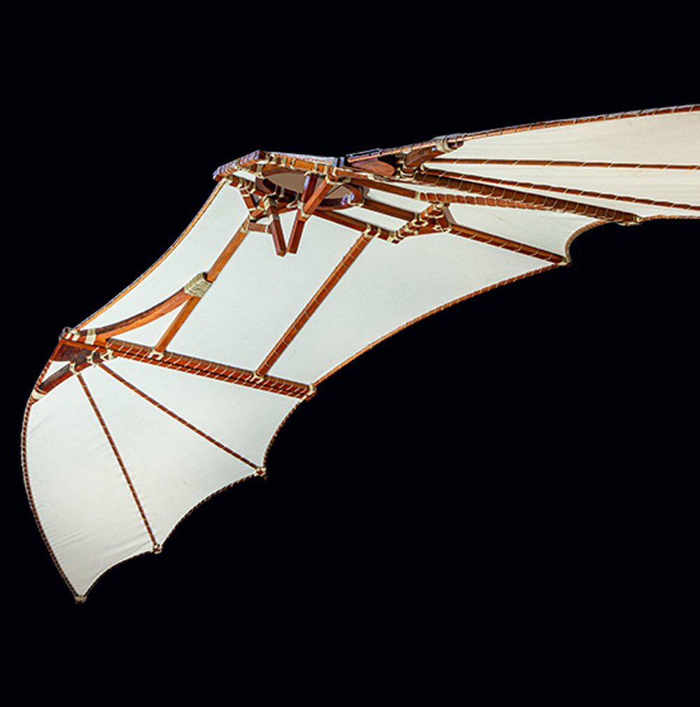 Este diseño bien definido en vuelo humano., replicado en la Sra.. B (F. 74 v) es uno de los mas conocidos, ya que describe la estructura de la máquina voladora a nivel de diseño., completo con alas y piloto, colocado en una posición boca abajo sobre la plataforma y comprometido en un nivel dinámico para explotar todas las partes del cuerpo para la propulsión. La imagen va acompañada de notas muy importantes., mientras explican los complejos mecanismos que impulsan el movimiento compuesto del ala., Activado por el ciclista presionando los pedales F y G., entonces uno levanta y el otro cierra el ala: “Él gira su ala, B lo gira con la palanca, C lo baja y D lo sube.”. Son instrucciones precisas para maniobrar las tres cuerdas., Eso, usando un sistema de poleas, doblan la punta del ala para abrirla y cerrarla, flexionarlo y hacerlo girar con una palanca.